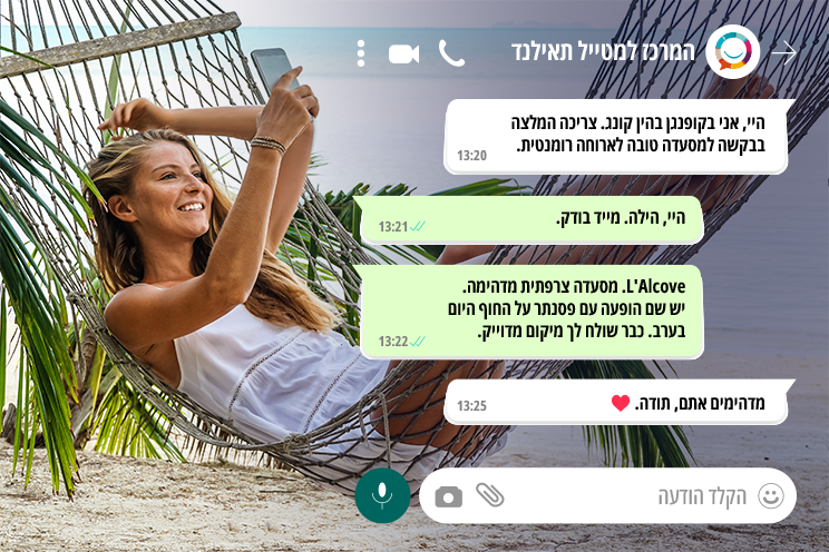 אנחנו חיים בתאילנד ומכירים כל דבר חדש, ישן וטוב. כאלה שפשוט אסור לפספס בטיול. המלצה שלנו היא המלצה של מקומי שמכיר ומתעדכן כל הזמן. אנחנו דוברים תאילנדית, עברית ואנגלית וזמינים לכם 24/7 לאורך החופשה שלכם. אתם למעשה מקבלים חבר תאילנדי מקומי שתוכלו לתקשר איתו בהודעת וואצאפ פשוטה או בטלפון בעברית. הייעוץ שלנו חינמי לחלוטין ולא כרוך בתשלום ונשמח לסייע לכם בכל שאלה ובעיה שתתקלו במהלך שהותכם בתאילנד הקסומה!